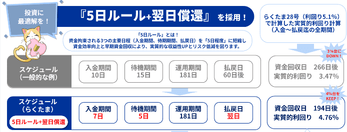 しかし、らくたまでは1日でも資金を効率よく運用できるように「5日ルール」と「翌日償還」の2つの仕組みを採用しています!