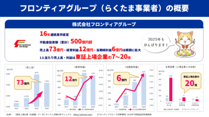 らくたまの運営元である株式会社フロンティアグループは、不動産事業を中心に安定した実績を残しています。