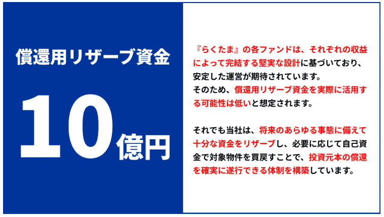 「らくたま」では投資家に元本を確実に返すために、業界初の「償還用リザーブ資金制度」を導入しています。
