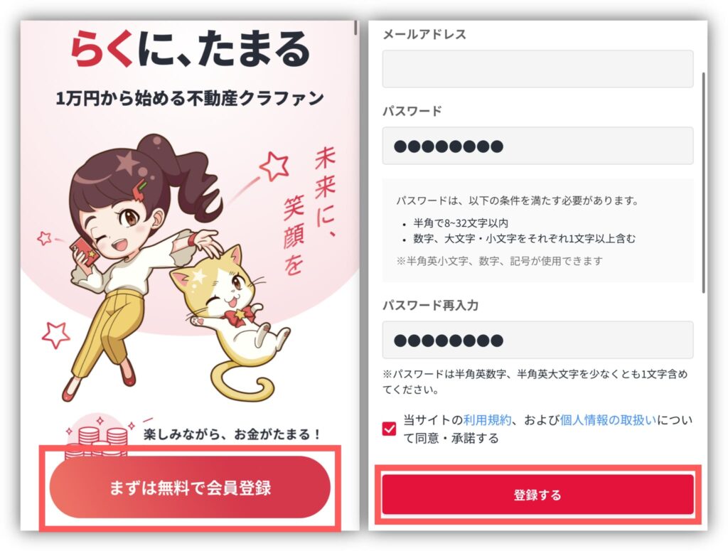 メールアドレスとパスワードを入力し、規約を確認してチェックをつけたら「登録する」をタップ。