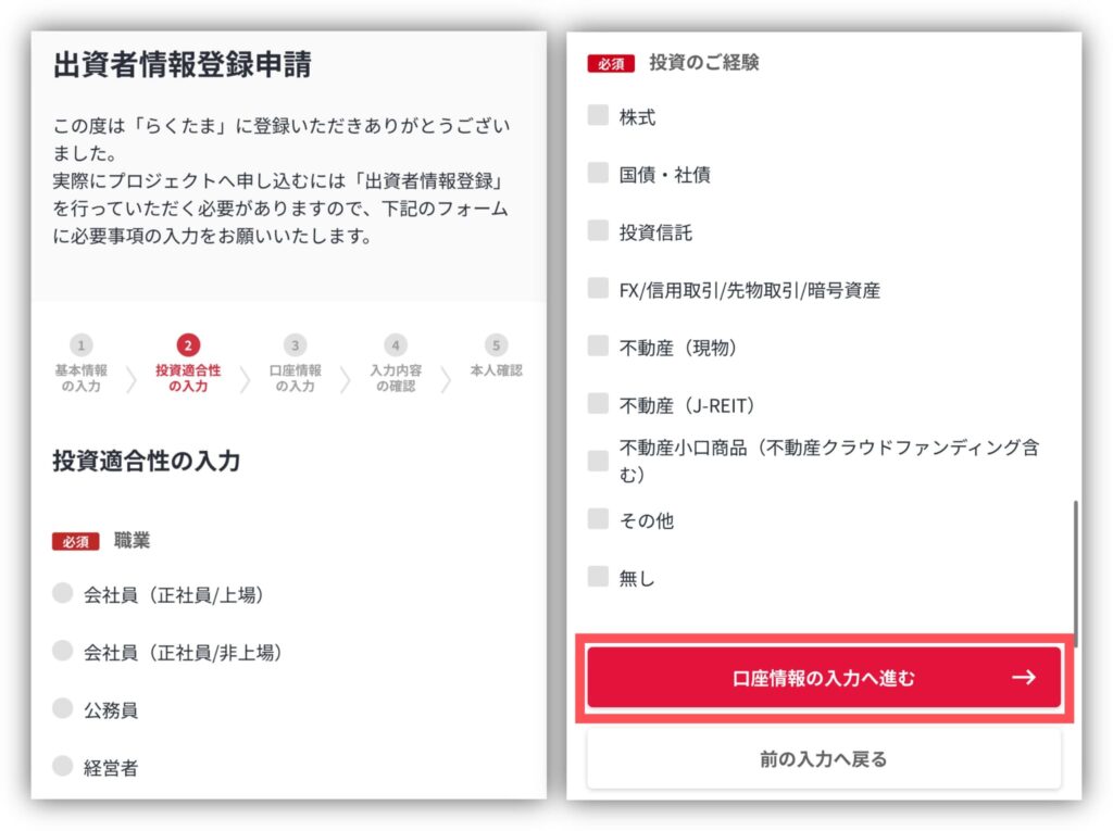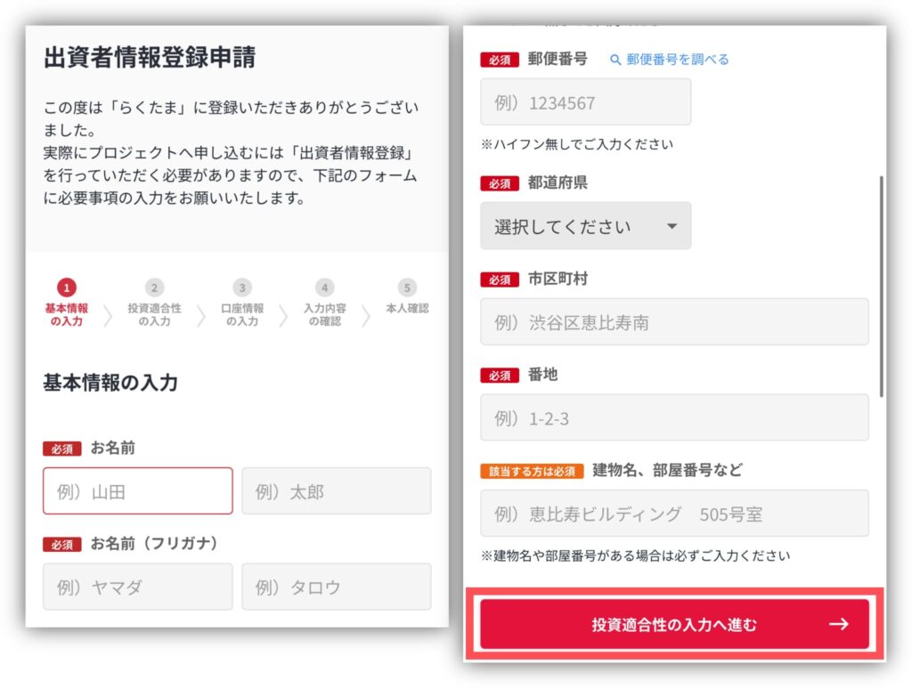 まず、氏名や住所を入力して「投資家適合性の入力へ進む」をタップしてください。