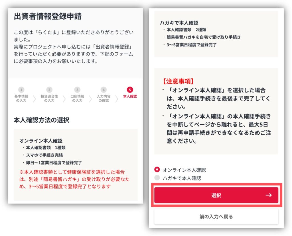 本人確認の方法を選んだら「選択」をタップ。